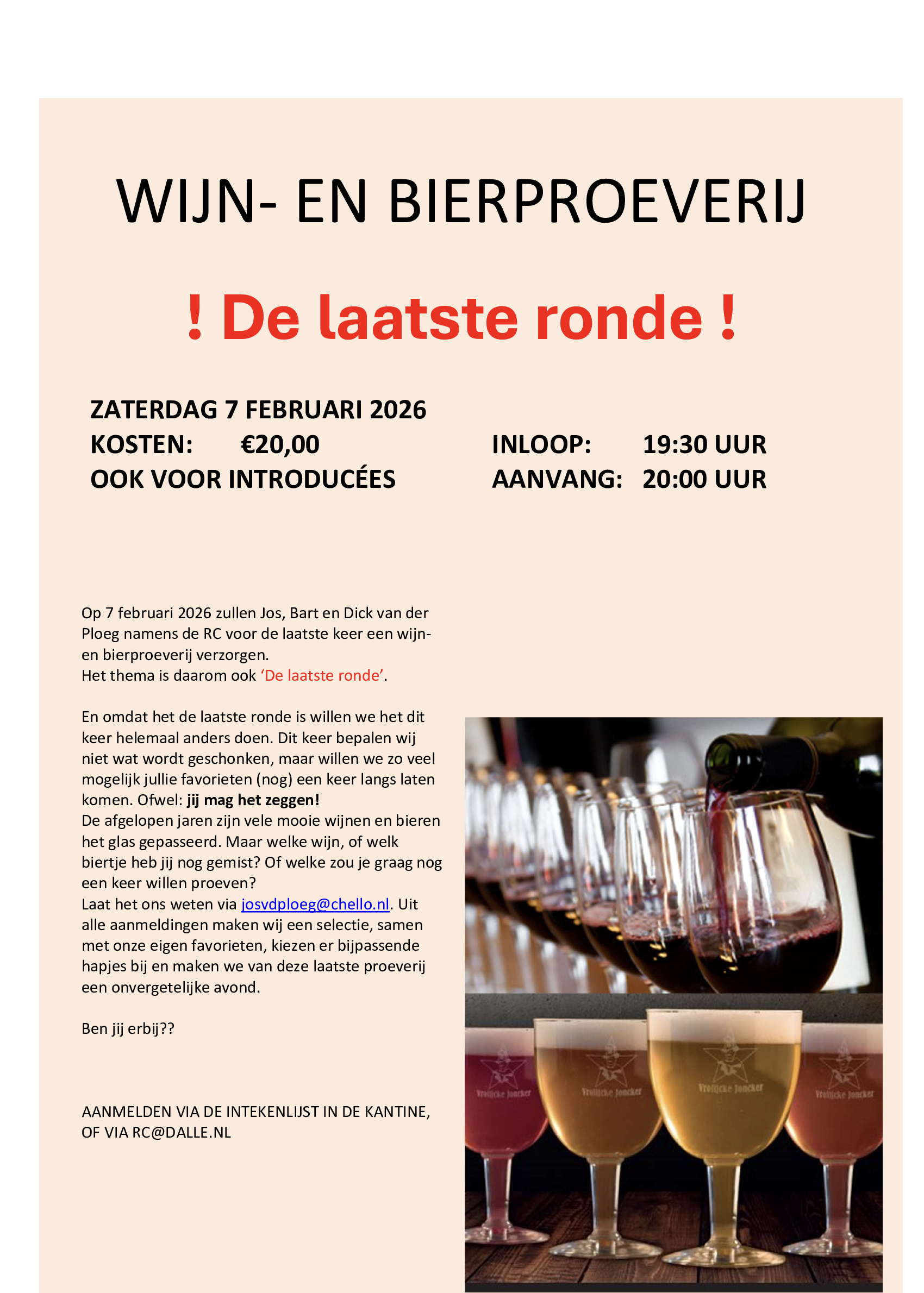 Op 7 februari 2026 zullen Jos, Bart en Dick van der Ploeg namens de RC weer een wijn- en bierproeverij verzorgen. Na het een aantal jaren het met veel plezier te hebben gedaan, gaan zij ermee stoppen en wordt dit de laatste proeverij. Het thema is daarom ook ‘De laatste ronde’.